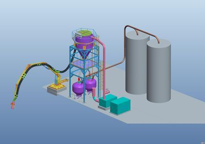 本系統采用羅茨真空泵作為抽吸的動力,通過液壓吸臂和吸頭將水泥從散裝貨倉中吸至分離器,然后采用自然沉降、旋風分離、布袋過濾等一系列工藝,將水泥與空氣分離,分離后的水泥經過三通閥,進入到倉泵①中,倉泵①料滿后料位儀報警,三通閥切換方向,水泥開始進入到倉泵②中,與此同時倉泵①的加壓閥、流化閥和出料閥打開,開始加壓送料,水泥通過管道和庫頂閥門的切換被輸送至一個或多個料倉中,倉泵①料送空后,倉泵②料滿,三通閥切換,倉泵①又開始進料,倉泵②開始送料,如此2個倉泵之間輪換進行吸料和送料,與物料分離后的清潔的空氣從分離器上部經過排風管,進入羅茨真空泵,然后從羅茨真空泵出風口排至大氣。