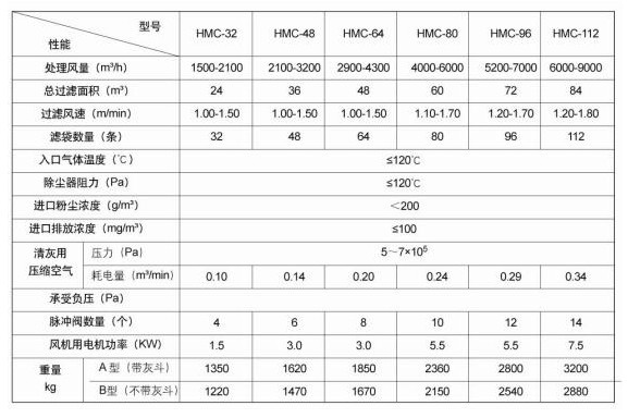 HMC脈沖單機除塵器有六個規(guī)格,每種規(guī)格又可分為標準帶灰式A型和敞開法蘭式(無灰斗)B型二種。其結構主要由過濾室、濾袋、凈氣室、灰斗、卸灰閥、脈沖噴吹清灰裝置、電控箱組成,箱體全部采用焊接結構。檢修門用泡沫膠條密封,保證除塵器嚴密不漏風。